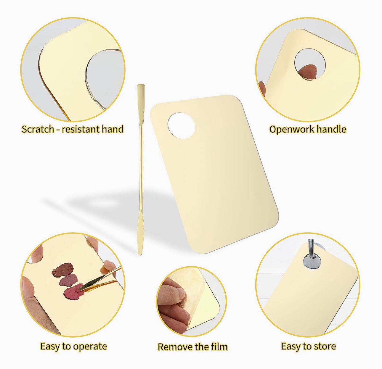 Sumérgete en la experiencia de la mezcla personalizada con la paleta de acrílico Bryka Lashes. Con un diseño en tonos rose gold y gold, esta paleta está especialmente creada para perfeccionar tus mezclas de maquillaje. Ya sea sombras, labiales o bases, la superficie de acrílico suave te permite mezclar con precisión, mientras que la espátula incluida garantiza una aplicación uniforme y profesional.