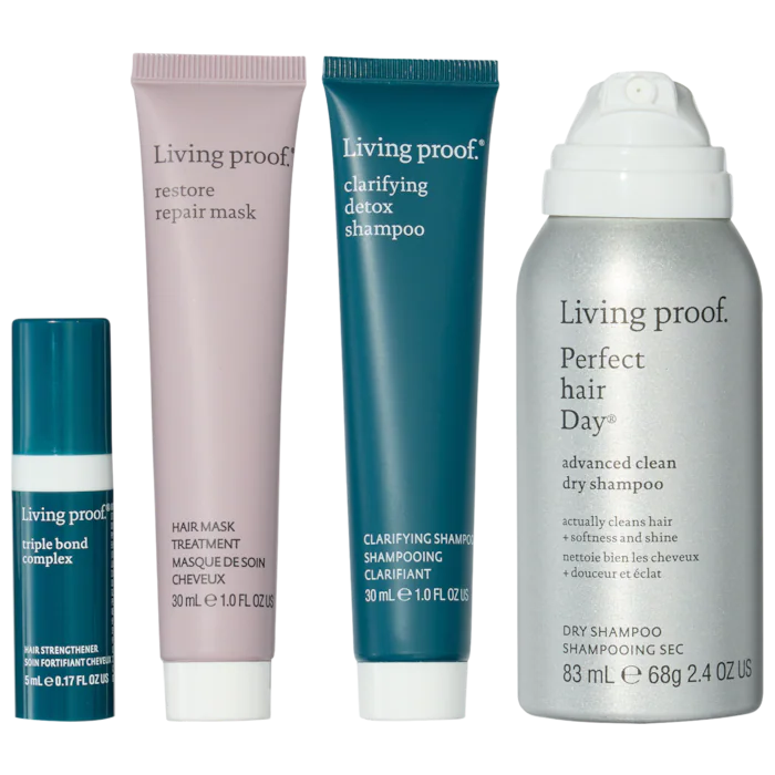 Dale a tu cabello el cuidado que tanto necesita con este kit de cuatro piezas de Living Proof para limpiar y fortalecer visiblemente las hebras dañadas.