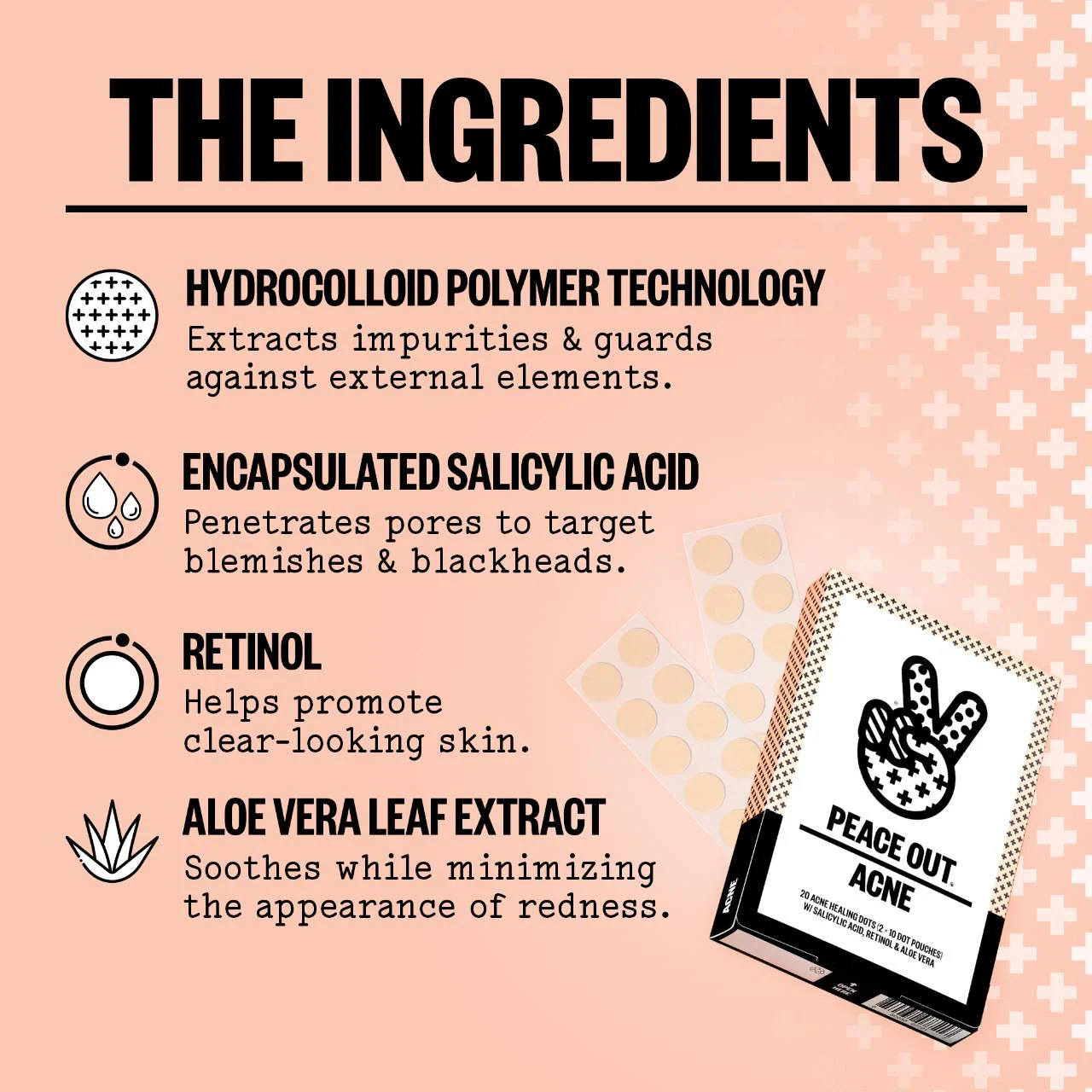 El único parche patentado para el acné que combina tecnología de polímero hidrocoloide limpio y principios activos para minimizar la apariencia de los granos durante la noche.