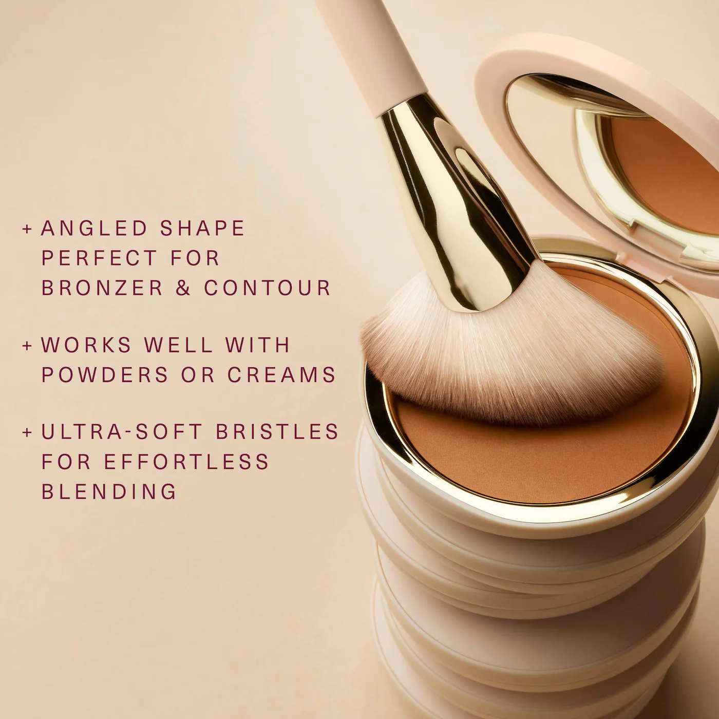 Una brocha multiusos para polvos con cerdas sintéticas suaves y una forma angular única, perfecta para difuminar bronceador, rubor, polvos fijadores y más.