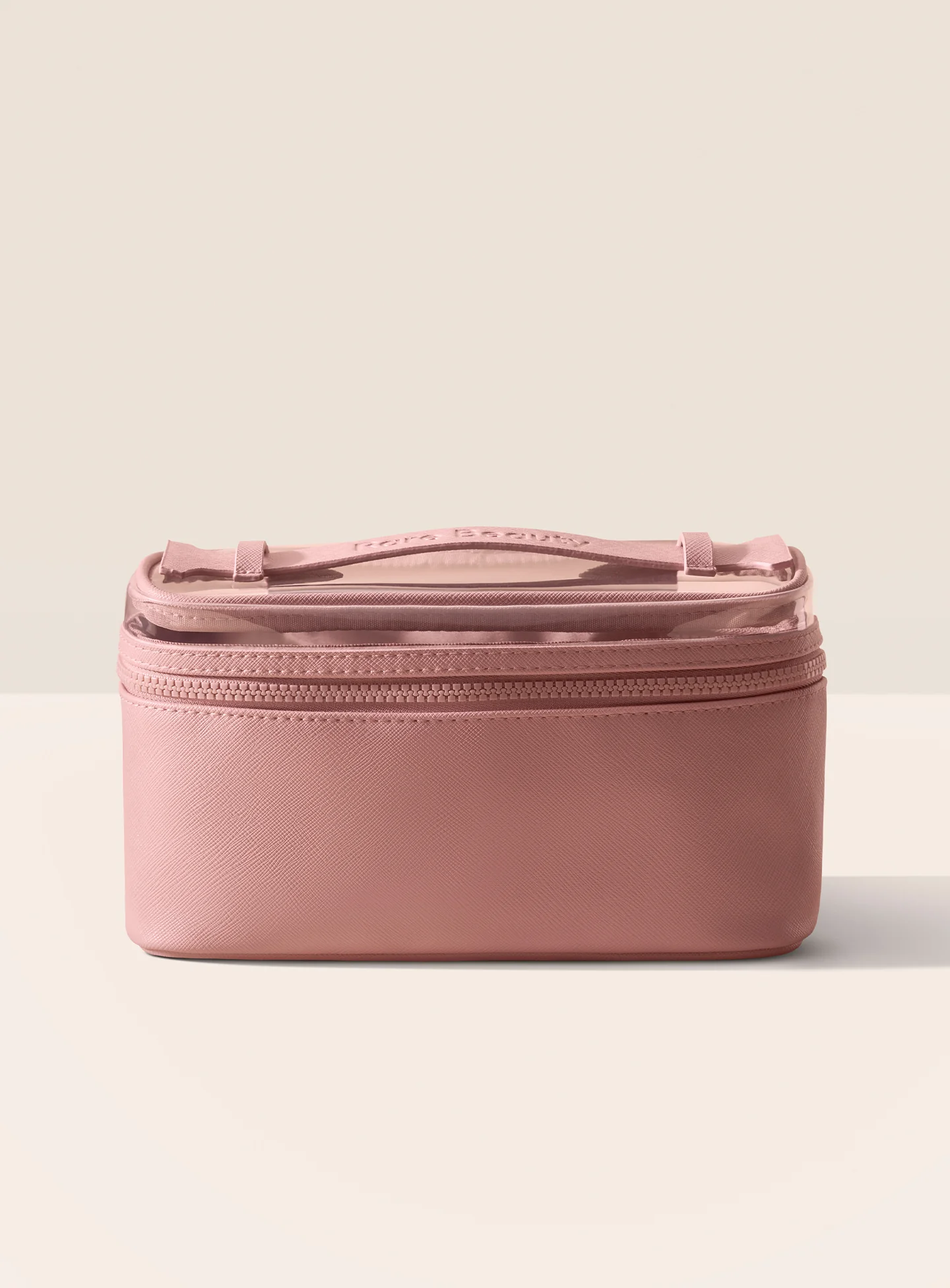 Fabricada en piel saffiano vegana en nuestro característico color malva Find Comfort, con una parte superior transparente con cremallera que te permite tener todo a mano.