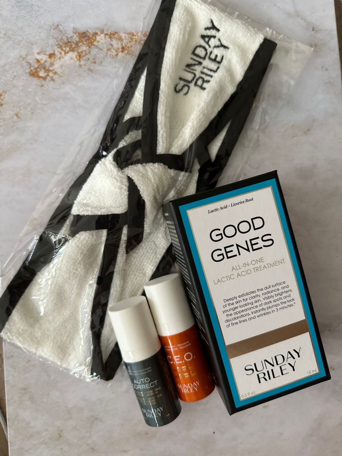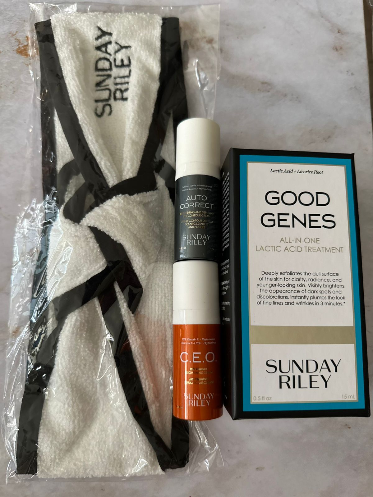 Revele una piel radiante y de aspecto juvenil con un potente trío de Sunday Riley, que incluye el tratamiento con ácido láctico AHA todo en uno Good Genes, C.E.O. Suero iluminador con 15 % de vitamina C y crema para ojos iluminadora y desinflamante Auto Correct. También recibirás una elegante diadema tipo toalla para mejorar tu rutina de cuidado personal.